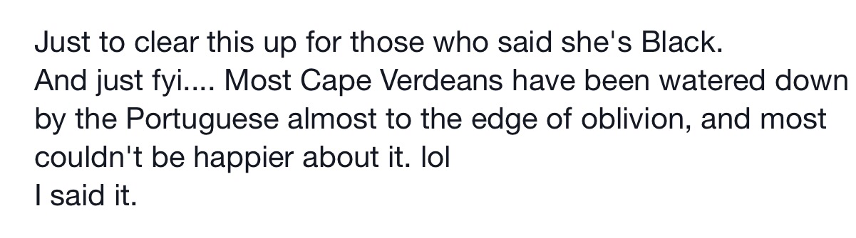 “Mutt” was thrown around quite a bit in these posts. And, apparently, many people agreed; notice the 16 likes as of the night this episode aired. What was it exactly that sparked this kind of rage toward Cape Verdeans? Was it that she used the words “superior” or “culture”? Was it because she was “airing our dirty laundry”? Was it because she participated in a dialog about an experience that had a profound affect on her life? After all, this was a documentary focusing on the experience of light skinned black women. Was what she said more hateful than the story told by a dozen other women on the same program? What I heard was a story very similar to my own and my reaction was quick and immediate in response to the ignorant comments I read.